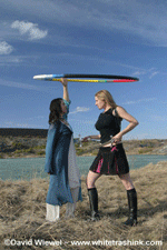 WHOOP WORKSHOP Most of us lead a fairly sedentary life, what with school, work, computers, tvs, driving...etc. This can lead to all sorts of back, leg and hip problems, not to mention the state of our internal organs being compacted in one small area. While Hula Hooping of the old was a fun pastime that typically involved the waist, Darlene's Whooping Workshop involves the whole body. The whoop moves from the hands and arms, to over the head, down the body, around the body; while the body learns to move around the whoop. Whooping loosens the spine and joints, and massages the abdomen. It increases circulation to all the muscles and tissues, as well as stretching and strengthening the muscles. It's about balancing the body and the brain, while challenging and developing your own skills. When done in both directions, using the waist or arms, we can create a new balance in our bodies, improve dexterity, and even affect our brain patterns, using our stronger side to teach our weaker side. It's a simple tool/toy that can be used by all ages. Children have a great time making up new games with whoops; older ones challenge their skills and each other in sport: inspiring us all how to look beyond the obvious. Wanna see some pics? Here's the Whooping Gallery "After witnessing the number of happy 'Whoopsters' that emerged from Darlene's workshops at the Northern Lights Festival last summer, I decided if ever I ended up at the same festival as Darlene again, I would take her workshop. So at Blue Skies Music Festival, along with a field full of other novices, I picked up a whoop. Darlene taught us first the basic moves and then the more elegant and challenging moves. It's one of the few workshops at a festival that is truly participatory. It's fun and focused and it carries you away. From the February 2005 Issue of Prevention Whoop it up! If you liked hula-hooping as a kid, you're going to love the latest take on this retro fad - heavy hoops. Compared with traditional lightweight hooops, these foam-covered, steel (?), 1-7 pound rings make your abs and obliques work harder and can more than double your calorie burn. Rigorous gyrating with a weighted hoop can raise your heart rate to scorch up to 110 calories in 10minutes - as much as running a brisk mile. "Moderate hula-hooping will burn fewer calories, but the workout is still impressive," says our scientific tester, Len Kravitz, PhD, an exercise scientist at the University of New Mexico. Selene Yeager